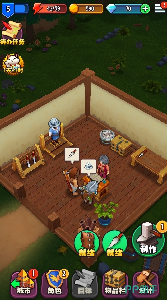 将前期的剧情全部过完后,玩家将正式开启自己的经营之旅。此时玩家最该作的,就是不断地来进行装备的制作,然后将它们卖出去来完成经验累积,更快地实现升级,让自己能招募更多的工人来制作更多的装备。每次制作装备都有概率获得生成高品质装备,它们的售价会更高。