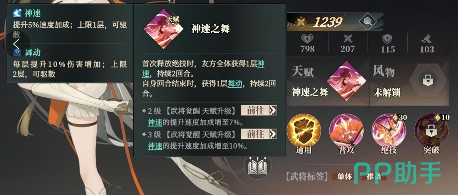 舞动这一效果更是独特,每层能够提升10%的伤害增加,而且舞动效果最多可以叠加至2层,不过需要注意的是,神速和舞动效果都有各自的上限,分别为1层和2层,并且可以被驱散,随着武将觉醒等级的提升,乔菱的天赋也会进一步进化,当达到2级武将觉醒天赋升级时,神速所带来的速度加成将增至7%,而当觉醒等级提升至3级武将觉醒天赋升级时,神速的速度加成更是猛增至10%。