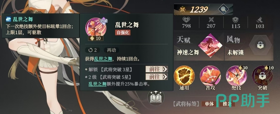 乔菱还有一个更为强大的突破技能叫做乱世之舞,这个技能带有自强化的效果,一旦获得乱世之舞,便能持续1回合,其效果能够让下一次绝技额外使目标眩晕1回合,而且这个技能上限为1层,可驱散,既保证了其强大的功能性,又避免了过于无解的平衡问题,当乔菱最终突破至2级武将突破5星时,乱世之舞会额外提升了25%的暴击率,这使得乔菱在战斗中不仅有更高的几率打出暴击伤害,而且一旦触发乱世之舞的眩晕效果,配合高暴击率的伤害输出,将对敌方造成毁灭性的打击。