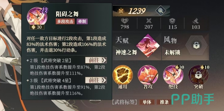 然而乔菱的真正价值体现在她的突破技能上,其中阻碍之舞这一技能堪称一绝,此技能具有多段攻击的特性,并且还附带牵制效果,能够对任一敌方目标展开2段强有力的攻击,在第一段攻击时,能造成83%的法术伤害,而紧接着的第二段攻击更是凶猛,会造成106%的法术伤害,同时还能击退敌人30%的行动条,当达到2级武将突破2星时,其第1段绝技伤害系数提升至87%,而第2段绝技伤害系数也相应提升至111%,进一步放大了这一技能的杀伤力,当乔菱突破至3级武将突破4星时,她的实力再次攀,。第1段绝技伤害系数提高到了91%,第2段绝技伤害系数也提升至116%。
