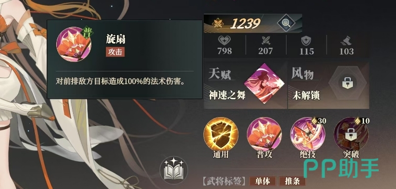 先来说说她的普攻旋扇,这一招式在战斗中表现较为一般,主要是对前排敌方目标造成100%的法术伤害,虽然看似没有太过于亮眼的能力,但在前期的一些小规模冲突或者面对单个敌人时,也能为队伍提供稳定的输出伤害。