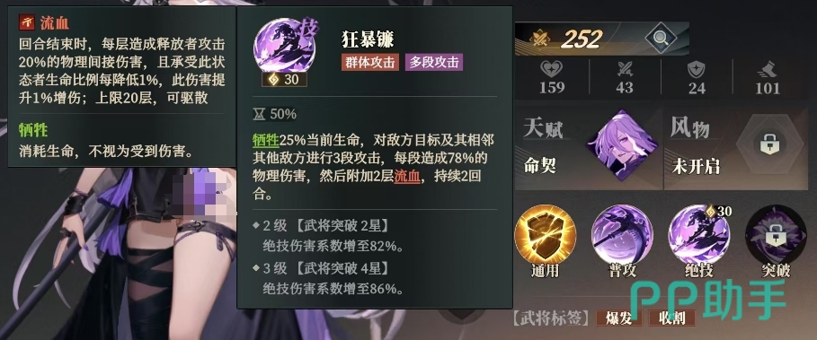 这流血效果不仅在回合结束时会按照释放者攻击力的20%造成物理间接伤害,而且每当承受此状态的敌人生命比例降低1%,该伤害还会提升1%的增伤,最高可叠加至 20 层,成为敌人难以承受的持续输出,但值得注意的是,这里的牺牲效果虽然会消耗张春华的生命值,但并不会被视为受到伤害,随着武将突破的深入,2 级武将突破 2星时,绝技伤害系数增至82%,而当达到 3级武将突破 4星,绝技伤害系数更是攀升至 86%。