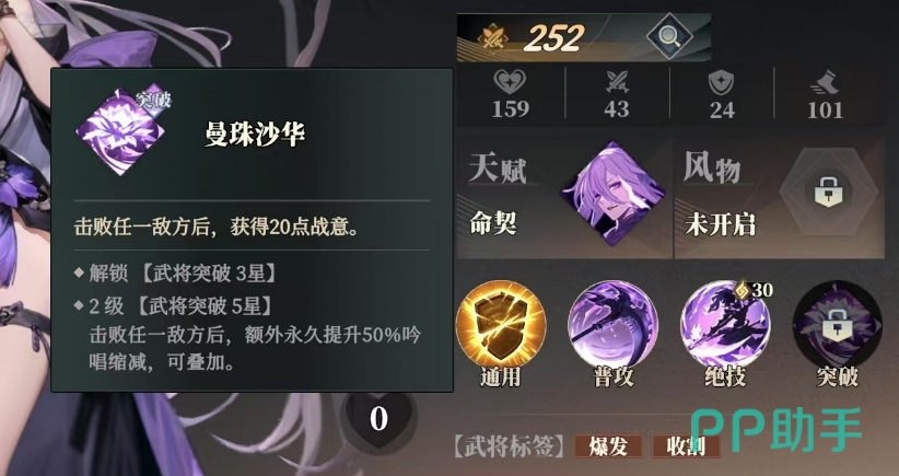 除了绝技之外,张春华的突破技能曼珠沙华同样不容小觑,每当她击败任一敌方单位后,便能获得20点战意,为接下来的战斗积蓄力量,尤其当 2级武将突破 5星时,这一技能更是进化到全新高度,击败敌人后不仅能获得战意,还能额外永久提升 50%的吟唱缩减,并且这一效果可以叠加,这意味着张春华在战场上能够更快地释放技能。