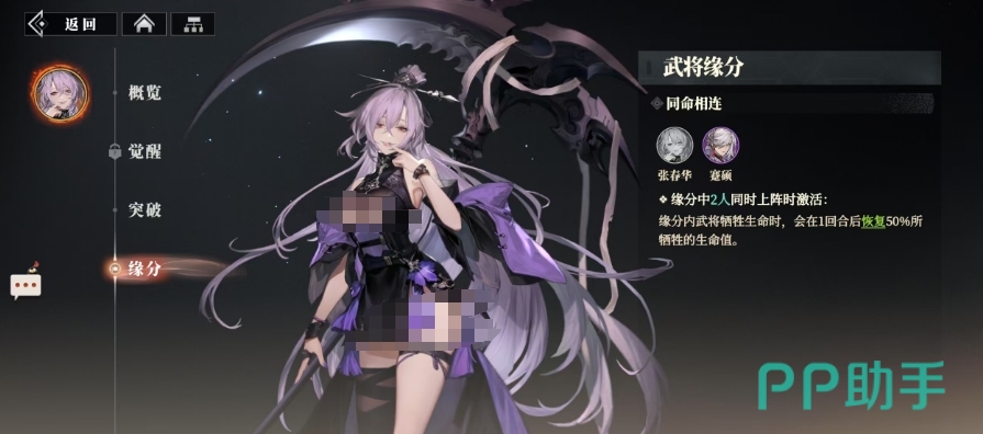 除了个人天赋外,张春华还与蹇硕有一个羁绊缘分,共同组成同命相连的缘分后,当这两位武将同时上阵时,在战斗中如果缘分内的武将为了胜利而牺牲生命,那么在 1回合后,他们将神奇地恢复 50%所牺牲的生命值,这种羁绊效果,也为玩家在安排张春华震阵容,以及整体效果排兵布阵时提供了更多的策略选择,当然针对高品质的武将多种羁绊效果来说,她的唯一一个羁绊不算很强,更适合在前期用。