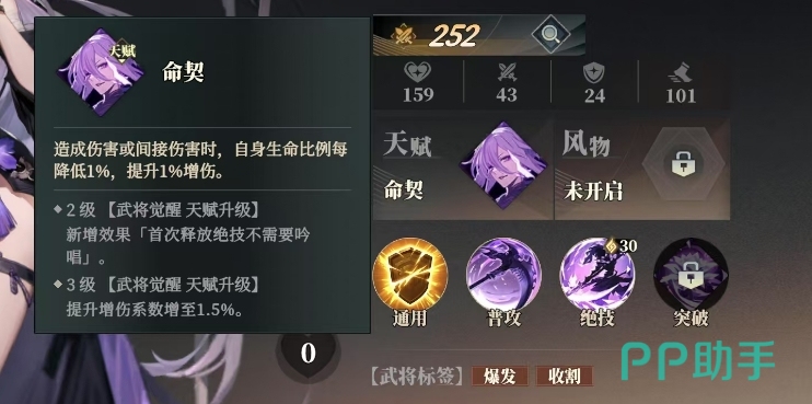 张春华以其独特的命契天赋脱颖而出,这一天赋使她在战斗中展现出非凡的爆发力,每当张春华造成伤害或间接伤害时,她的生命之力仿佛被唤醒,自身生命比例每降低 1%,她的增伤能力便随之提升1%,这种设计与她绝技中的牺牲机制相互配合,让她在战场上越战越勇,随着武将觉醒的推进,张春华的天赋也得到了进一步的升华,2级武将觉醒天赋升级后,她首次释放绝技时无需再经过吟唱准备,这一改动提升了她在战斗初期的突袭能力,而当达到 3级武将觉醒天赋升级时,张春华的增伤系数更是提升至 1.5%。