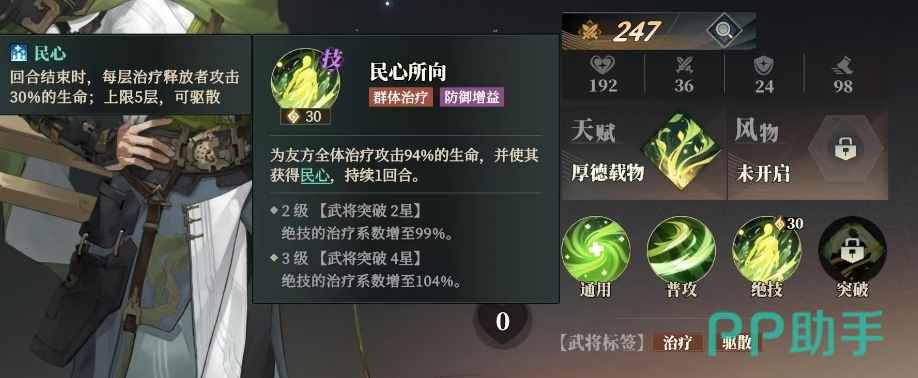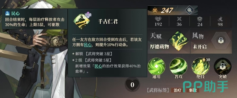 刘备的突破技能千古仁君,在每一个敌方回合结束之际,只要友方还承载着民心,他们便能获得释放者攻击力30%的生命治疗,最多可叠加五层,而当刘备最终完成5星的蜕变,民心的治疗效果更是获得了40%的治愈率加成,这个民心属于一个比较具有武将特色的状态,只要是在这个状态之中,刘备就有足够的治疗效果可以利用起来哦。