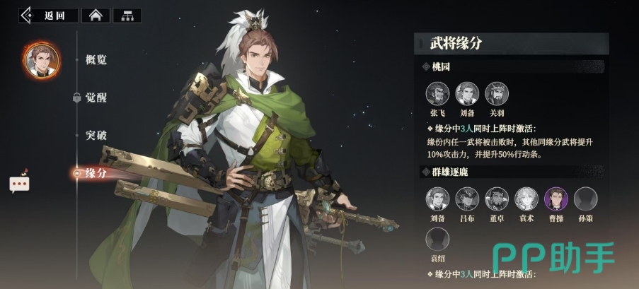 提及刘备还有一个桃园结义的羁绊效果,当张飞、关羽与刘备并肩作战,三人同时在场的时候,造成的羁绊效果就是一旦其中一人不幸陨落,幸存的两人便如同怒火中烧的战神,攻击力飙升10%,行动条激增50%,而另外一个羁绊效果就是群雄逐鹿,这个羁绊效果牵扯到的武将会更多,其中只要是刘备他与董卓、袁术、曹操等枭雄并列,任意其中的三人同场作战的话,每增加一位同缘武将,己方的优势就会有多提升,此时伤害与防御同步提升2%,
