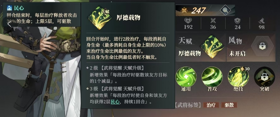 刘备,不仅有治愈盟友的能力,更有天赋上面独特的能力,厚德载物这个天赋在每个回合一开始的时候就可以施展双重治愈,他能消耗自身至多10%的生命上限,为生命值最低的友军注入一定的恢复效果,随着觉醒刘备的天赋效果会越好,二级觉醒后不仅可以治愈伤口,更可以驱散一些负面效果,当然此时的每段治疗都伴随着一个减益效果的消散,让战友们得以重焕生机继续战斗,而三级觉醒后每一份治疗都化作了两层民心的加持,也让刘备自身有足够的恢复效果。