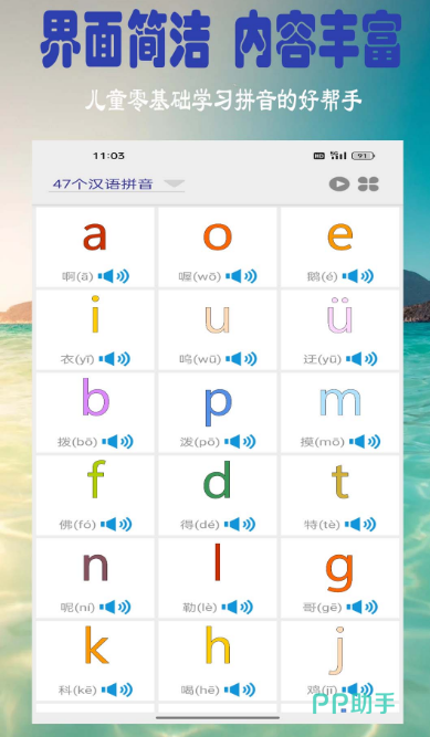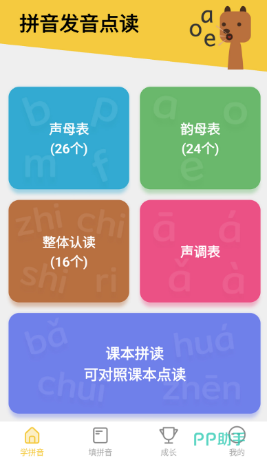 想要学习拼音,想要拥有更加标准的发音点读模式,此应用完美呈现,主要的功能就是帮你学习拼音,有声母韵母整体认读音节不同的拼音表,强大的音调,在简单容易学习的模式之下详细掌握具体发音,对小伙伴们的学习有着很大的帮助。另外也有很多汉字,对于零基础学者来说特别适合。