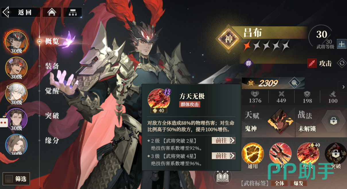 他的绝技“方天无极”会对敌方全体造成88%物理输出值,对生命比例高于50%的敌人,本次伤害将提升100%,绝技升到2级会让伤害系数增加至92%,升到3级会让伤害再增到96%。