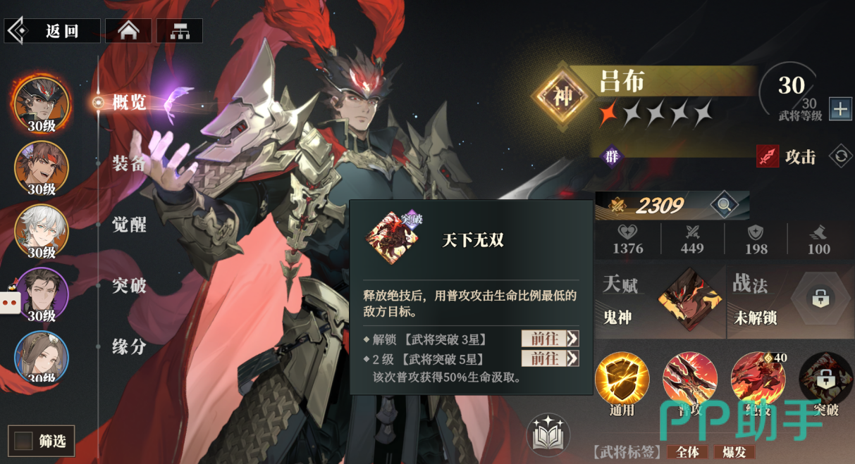 他的突破技“天下无双”会在每次释放完绝技后,用普攻攻击当前生命比例最低的敌人,将该技能升到2级,还会让普攻额外获取到50%的生命汲取,增加自身一定的生存能力。