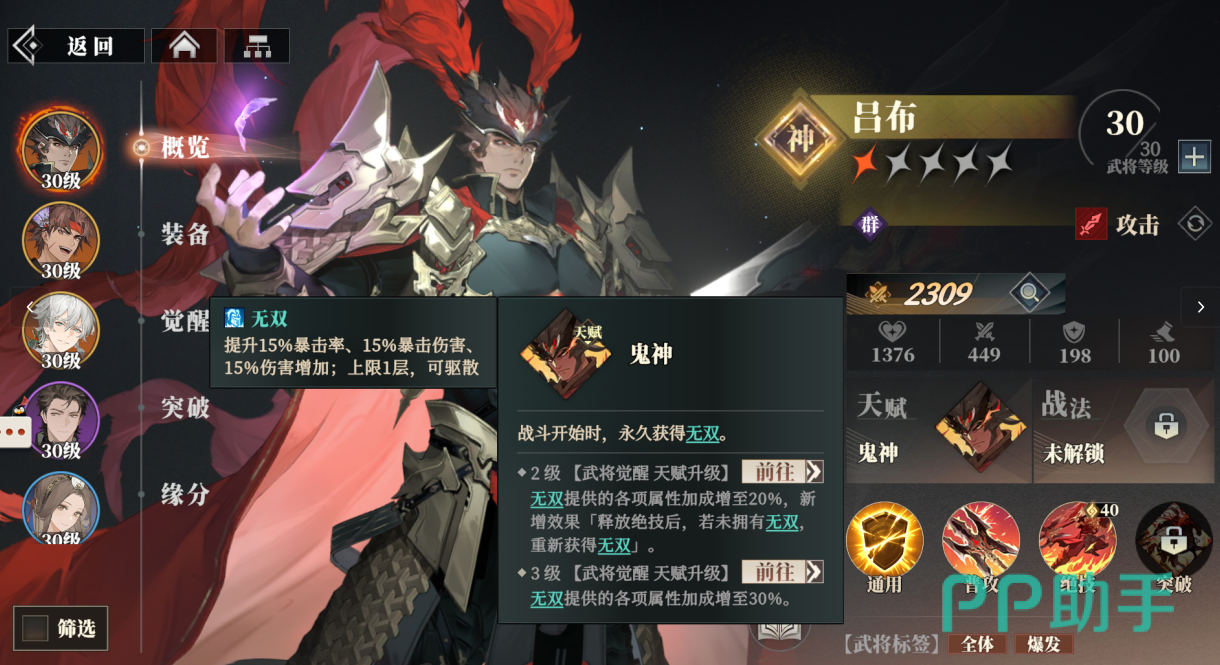 吕布的天赋“鬼神”会在战斗开始时,永久获得“无双”效果,“无双”能提升他15%暴击率、暴击伤害和伤害增加,上限为1层可被驱散,将天赋升到2级“无双”提供的各项属性将增加到20%,并且在之后释放绝技时,若身上没有“无双”,则再次提供,3级会让“无双”各项增益增加到30%。