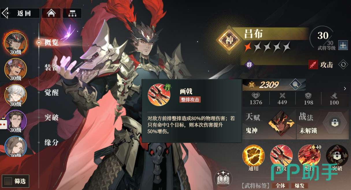 他的普攻“画戟”会对敌方的前排形成80%物理伤害,若只成功命中1个目标,则本次伤害将提升50%,他的通用“破甲”会得到10点战意值和持续1回合的破甲效果,破甲能无视敌方20%防御,不可以叠加可被驱散。