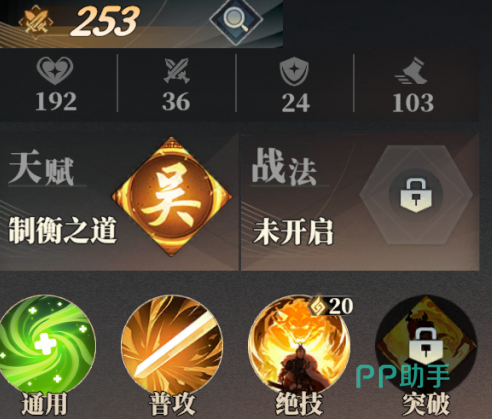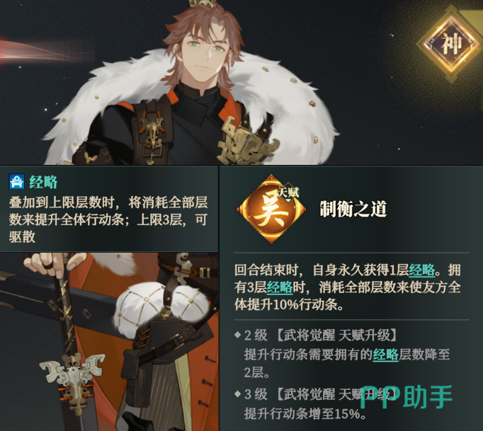 孙权的天赋是制衡之道。回合结束的时候可以永久获取1层经略,在拥有3层的时候将会全部消耗掉来提升我方的行动条10%。2级则是让消耗的经略层数便为2层。3级行动条增加为15%。