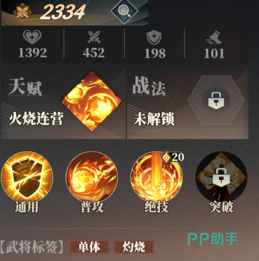 他的突破技则是红莲业火。这个技能在陆逊每一次行动之后为敌方全体附加1层灼烧,持续2回合。2级的话则是灼烧回合数变成3回合。天赋则是火烧连营。当绝技造成伤害的时候会将目标的灼烧层数复制给相邻的敌方,复制的灼烧持续1回合。2级则是如果目标有灼烧,那么伤害提升20%。3级则是复制回合数提升2回合。