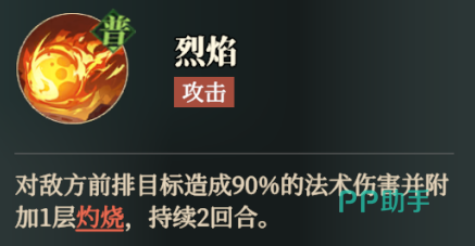 他的普攻是烈焰,这个攻击是对敌方的前排目标造成90%的法术伤害并附加一层灼烧。灼烧在每一回合开始的时候可以造成攻击者30%的法术间接伤害,上限20层,可以驱散,持续2回合。