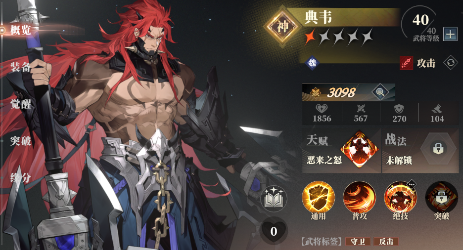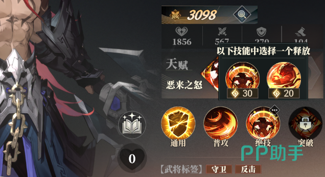 通用技“破甲”,10点战意获取20%防御穿透,可以在不需要他输出的场合或者其他技能冷却的时候使用。普攻是对前排整排敌人的物伤,突破升星可以提升伤害系数。