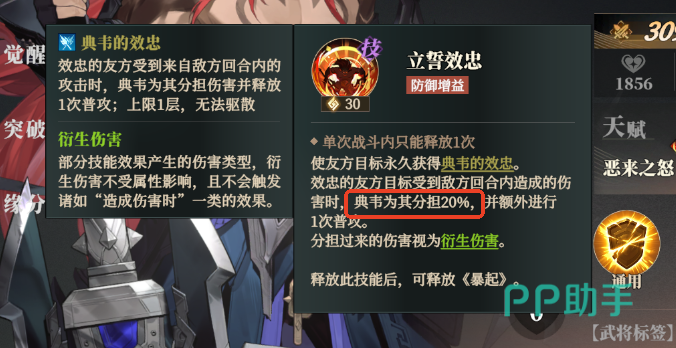 典韦的天赋“恶来之怒”则是与绑定队友形成联动,友方血量降低自身普攻伤害提升,并且在觉醒天赋后新增绑定友方倒下,额外释放2(4)次普攻,甚至有时候可以采用卖队友战术来提升攻击频次打一波爆发。