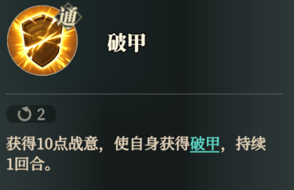 乐进的通用技能是破甲,这个技能可以让乐进自身获取到10点战意,同时获取到1回合的破甲,破甲的能力可以让其无视20%的防御,此技能上限1层,可以被驱散掉。他的普通攻击可以对前排的单位造成100%的物理伤害。