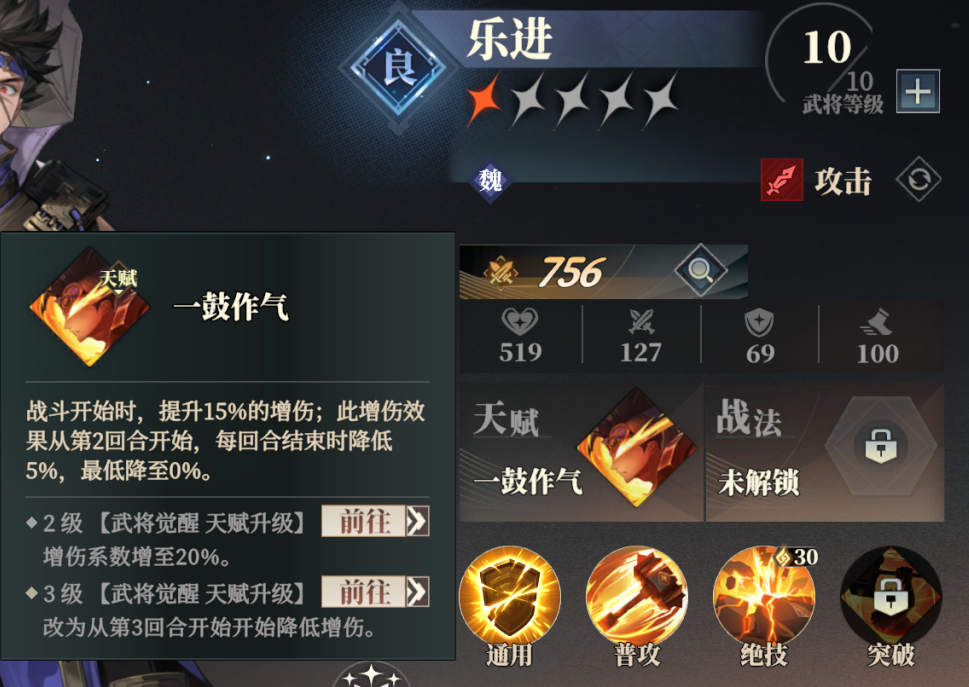 他的天赋能力叫做一鼓作气,这个技能在战斗开始时会提供15%的增伤。此增伤效果将会从第二回合开始在每个回合结束的时候将会降低5%,最低降低到0%。此天赋2级变为20%的增伤,3级则是降低从第三回合开始。