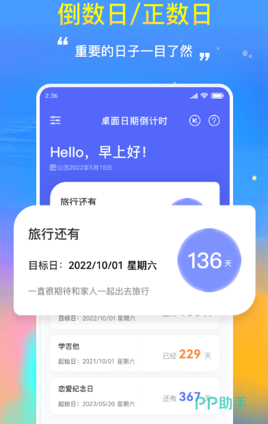 可直接放到桌面上的app,超过上百万用户都已下载记录你期待的每个重要日子。有倒数日、正数日,不需要打开app,在桌面当中就能够详细查看,也有微信提醒邮件提醒同一个账号支持多设备登录,让重要的日子离你越来越近。有精美的组件,多种款式任意选择,有相当丰富的主题,可任意更换也有密码保护,全方位保护你的隐私不被泄露。