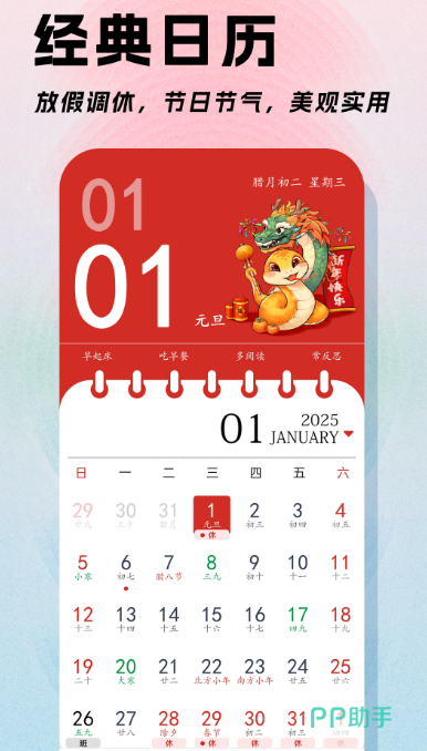 日程提醒高效出行所有内容都能一目了然的看到,包括天气万年历星座等,节气变换事项代办等各种功能全部在这里在线搜索。精美的画面展示,相当完整的节日日历,节假日或者休息日等全部都能够清晰的在这里备注,另外还有国际节日以及传统节日,不错过任何重要时期。有相当出色的日程提醒,包括生日提醒,纪念日提醒等。