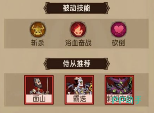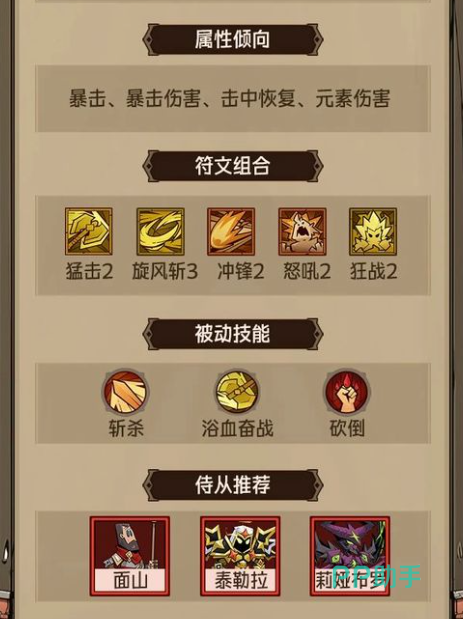至于被动技能的话,那么我们就可以选择浴血奋战斩杀以及砍倒,这样就能通过高额的斩杀线让你迅速秒掉对手。并且能够迅速恢复血量,避免自己倒的太快。阵容方面的话推荐用面山+霸迭+莉娅布罗,就可以通过护盾为你抵挡伤害。后两个的话就能够增加范围伤害,跟你一起输出。