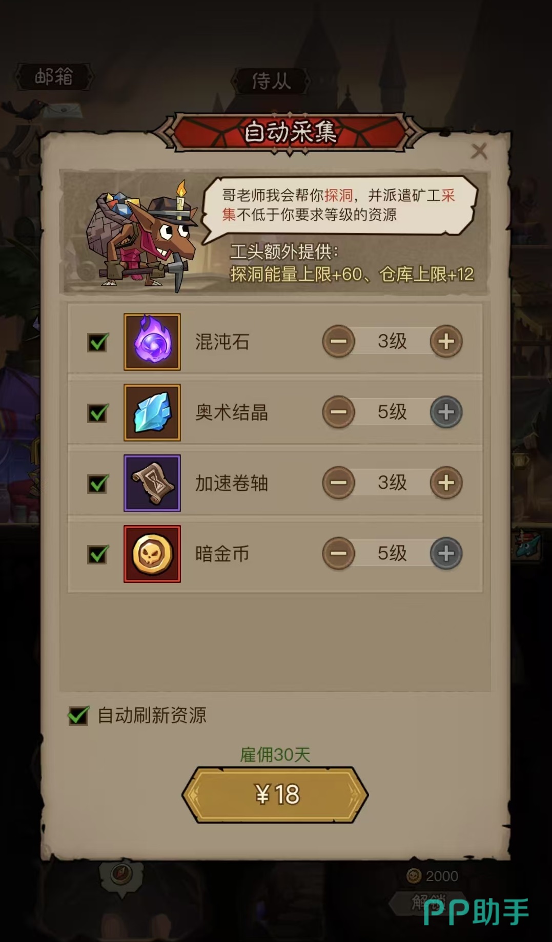 其实游戏在战斗机制方面非常简单,不需要有任何操作,只需要不断的去砍就可以了,不用担心浪费混沌石头,也不要担心溢出浪费经验。第1天还有一个很重要的事情就是去挖矿,无论怎样都必须把挖矿开出来,然后直接开启自动挖矿功能。选择三级以上的加速券和混沌石,另外两个只要5级以上的。然后是商店先看一下黑市,如果经济条件允许,把打折的秘法卷轴和金锤全都拿下,加速卷轴没有必要购买太多,不用在这里浪费金币。