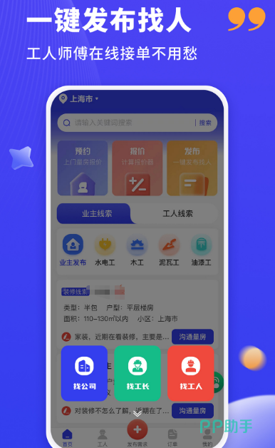 价格透明,又拥有众多单字的接单app,装修水电工,装修木工,油漆工,泥瓦工等都可使用这款app。所有用户都是实名认证的,拥有专业的客服团队让你接单不用愁,有全面的招工信息,我们可按照地区或者其他的方式去查找,让你接单不用愁。