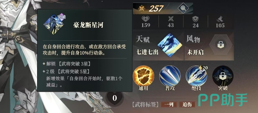 除了强大的攻击力,赵云还拥有豪龙断星河这一突破技能,无论是在自己回合进行攻击,还是在敌方回合承受攻击时,赵云都能获得10%的行动条提升,这使他在战场上更加灵活,而当赵云达到2级武将突破5星时,他将解锁全新效果,每个回合开始时,自动驱散一个作用于他的减益效果,这一能力极大地增强了赵云的生存能力和持续作战能力。