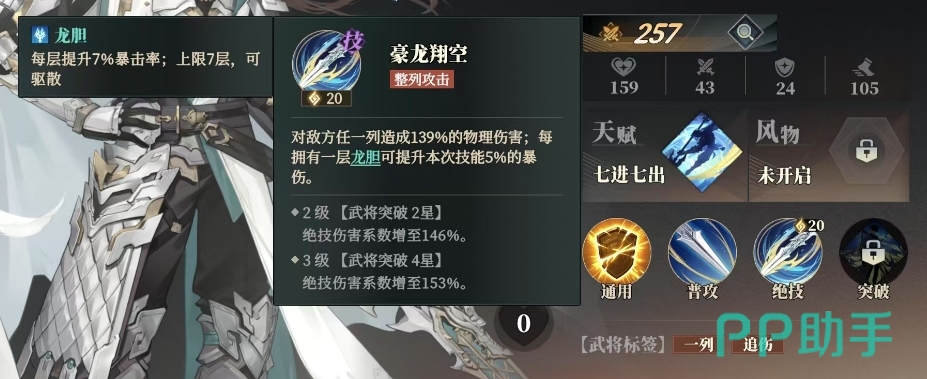 赵云的绝技豪龙翔空,同样展现出惊人的破坏力,作为另一整列攻击技能,它能对敌方任意一列造成139%的物理伤害,并且每层龙胆的存在都将使这次技能的伤害提升5%,随着赵云实力的提升,这一技能的伤害系数还将进一步提升,当赵云达到2级武将突破2星时,绝技伤害系数将增至146%,而3级武将突破4星时,更是能达到153%的高点,所以基本他的技能都是跟上面龙胆的加成有关的。
