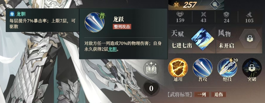 赵云的普攻名为龙跃,这一整列攻击技能能够对敌方任意一列造成高达70%的物理伤害,同时就算是普攻,大家也可以看到用这个技能的时候赵云自身永久享有两层龙胆效果加持,每层龙胆都能为他带来7%的暴击率提升,且最多可叠加至七层,此效果可被驱散,所以他的普攻其实相比别人简单的输出动作而言都要强上一些。