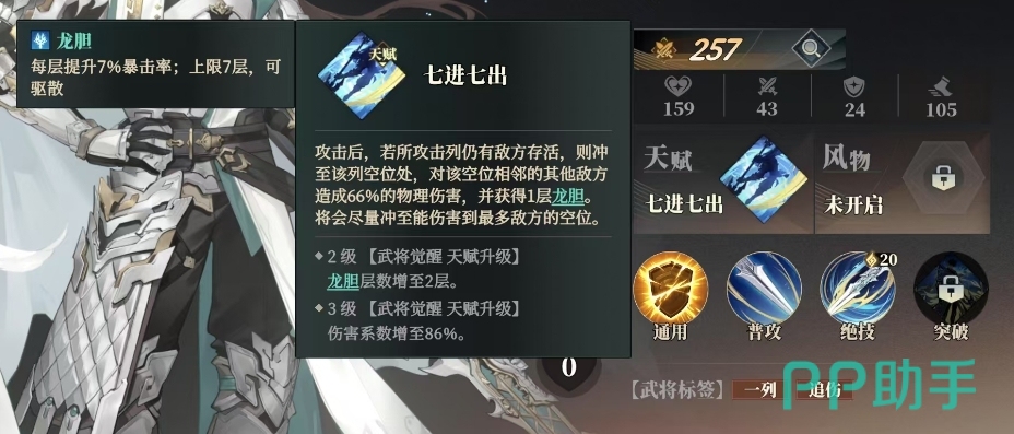 赵云还有一个独特的七进七出天赋技能,这个技能就代表了他的名场面,每当赵云发起攻击后,若他所针对的敌方列中仍有存活的敌人,赵云将如龙腾九天般,瞬间冲向该列的空位,抵达空位后,赵云会对相邻的敌方单位造成高达66%的物理伤害,同时他的英姿飒爽也为他赢得了一层胆效果,所以这个天赋虽然是有条件才可以出触发,但是相对赵云本身带有龙胆增益效果的加成来讲,数值还是有很大提升的。