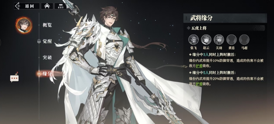 在赵云的武将缘分中,有一个羁绊效果叫做五虎上将,当张飞、赵云、关羽、黄忠、马超这五位虎将中有三人同时上阵时,他们之间将产生奇妙的共鸣,使彼此的防御穿透能力提升10%,并且他们所造成的伤害将无视敌方的护盾直击敌人要害,而当这五位英雄共同战斗时,他们将解锁更为强大的羁绊效果,防御穿透能力将进一步提升至20%,且依旧能够无视敌方护盾,这样的组合也是大家可以考虑的阵容组合。