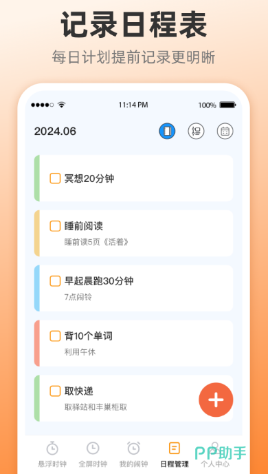 悬浮提醒时钟,秒杀提醒多种提醒皮肤可以任由选择,而且不需要开通会员就能够免费使用,另外也有闹钟提醒,每件重要的事情都可以定制闹钟当做提醒。如果日常生活当中有很多繁忙的事情,不妨选择记录日程表,记录重要的事情并每天坚持打卡,让你足够自律。