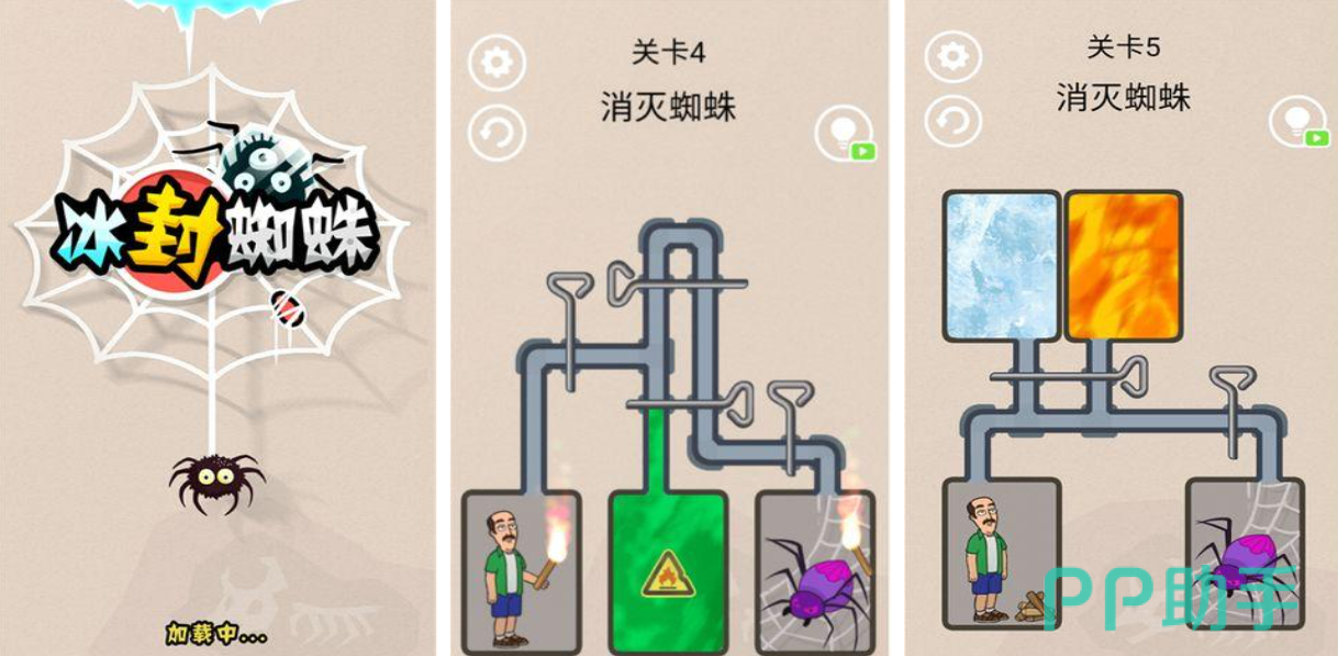 冰封蜘蛛是款玩法别具一格的益智闯关类作品,游戏闯关理念可以说是颠覆常规,你需要帮助男主角消灭蜘蛛并躲避机关,成功将蜘蛛消灭掉就可以完成主线任务,益智解谜与拉环式闯关的玩法进行融合,游戏中的机关多样你都可以灵活使用消灭蜘蛛,关卡难度较高让整体挑战性更胜一筹,充满无限的内容设定也给大家提供耳目一新的感觉。
