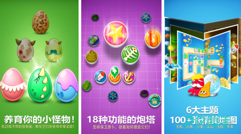 《保卫萝卜》构建了一个架空世界,玩家承担着守护萝卜、抵御外星人入侵的重任,每个萝卜初始拥有10点生命值,一旦被外星人“啃咬”10次,生命值归零,游戏便宣告失败,反之,若能成功歼灭所有入侵外星人,玩家则赢得胜利,玩家在游戏场景的闲置区域安置炮塔来抵御怪物,炮塔可在游戏进程中持续升级至顶级,升级后不仅外形改变,攻击力也大幅增强。