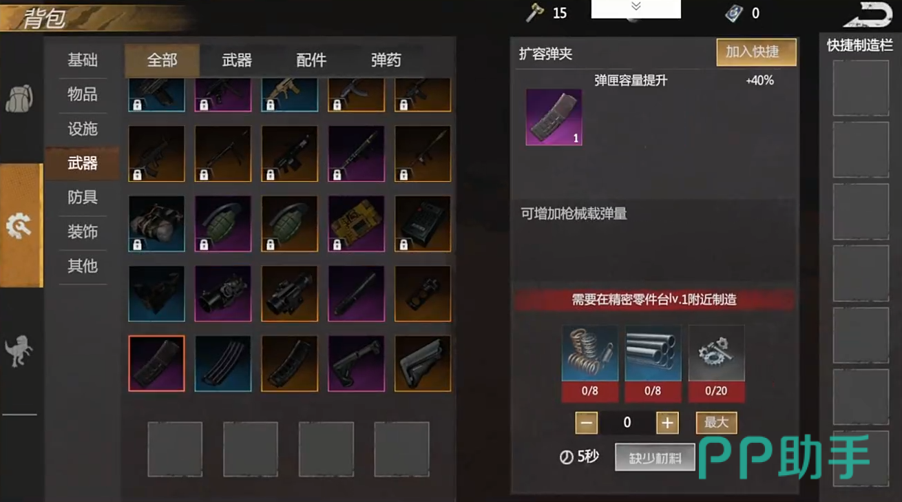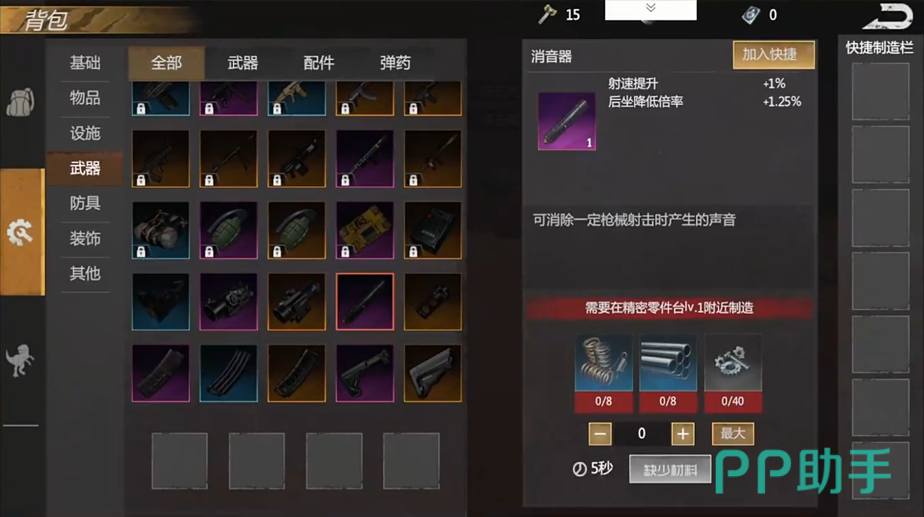 消音器可消除一定枪械射击时产生的声音;补偿器主要用来提高枪械射击的精准度;快速弹匣能增加武器换弹速度;扩容弹匣主要用来增加子弹容量;快速扩容弹匣增加枪械载弹数量并提升换弹速度;轻型枪托、竞技枪托能提升枪械射击的精度。