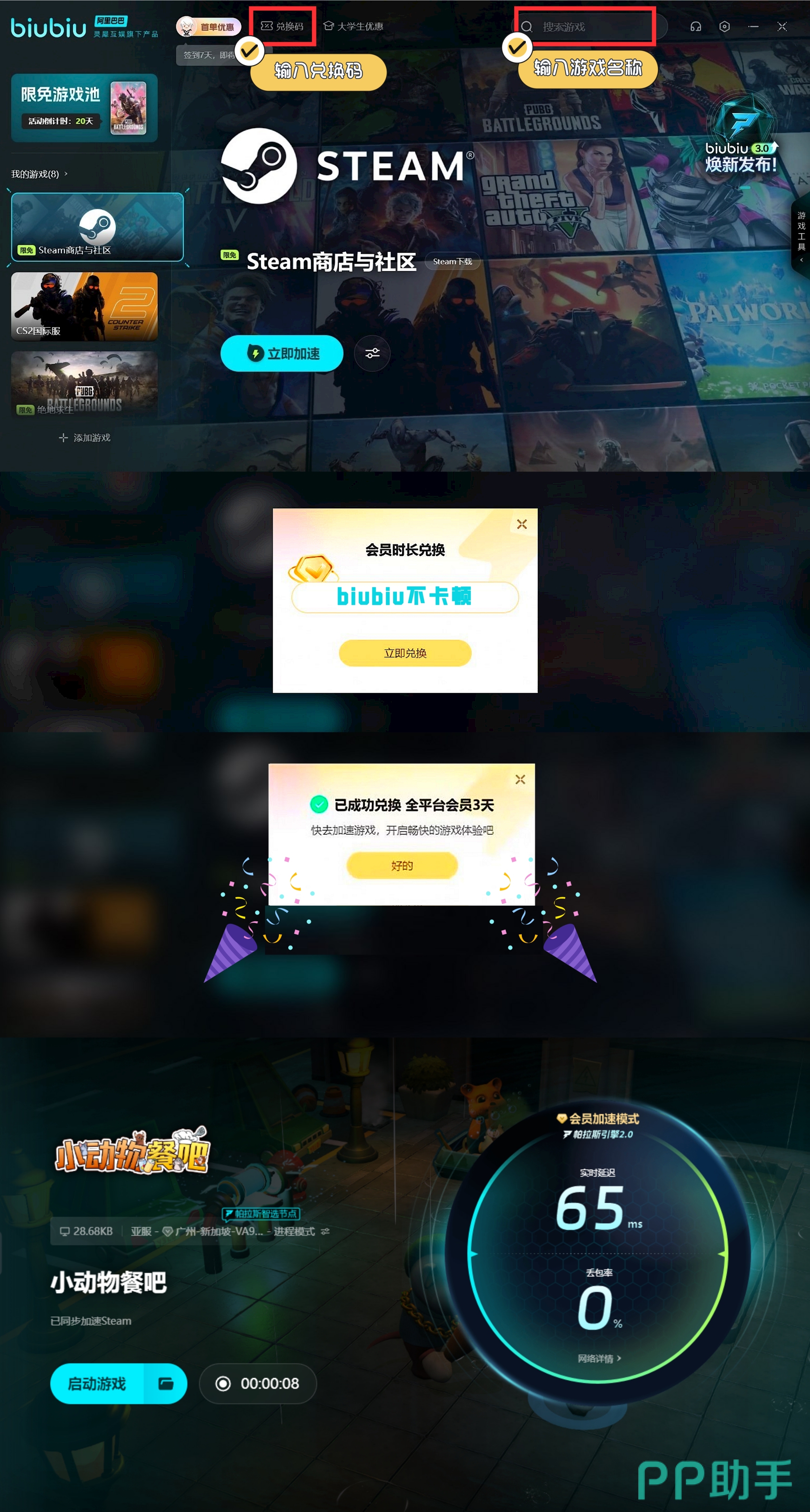 若是想要去解锁更多加速时长,其实还可考虑点击界面中的兑换按钮,然后在其中去输入【biubiu不卡顿】,如此一来所有平台用户都能顺利的领取到72h的加速时长,让自己去长时间体验游戏,而不用在担心会有卡顿等方面问题的影响。