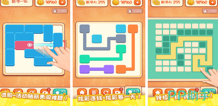 天天爱连线游戏里,游戏融合了多种经典小游戏玩法,每种模式都独具魅力,炫彩连接模式中玩家需要将相同颜色的端点进行连接,并且连接线路必须布满整个场景才能成功过关,逃脱模式类似华容道游戏,玩家要通过移开障碍方块,使目标方块顺利到达出口,爆破水滴模式的玩法与经典的十滴水游戏类似,玩家通过爆破水滴来消灭界面内的所有水滴。