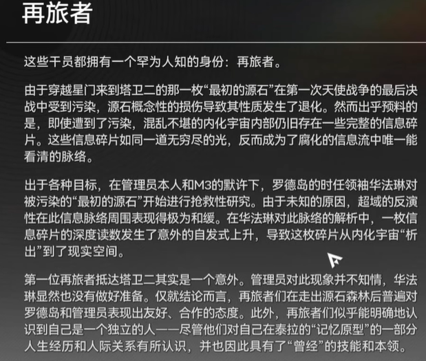 在旅者的身份其实就是穿越者,从另一个世界穿梭到塔卫二的时空,也就是目前游戏所在的地方,至于为什么可以进行穿越,主要是这名角色是被源石记录过,而原本明日方舟的多数干员都是被源石刻印过的,所以理论上原作的很多角色都会在本作出现。