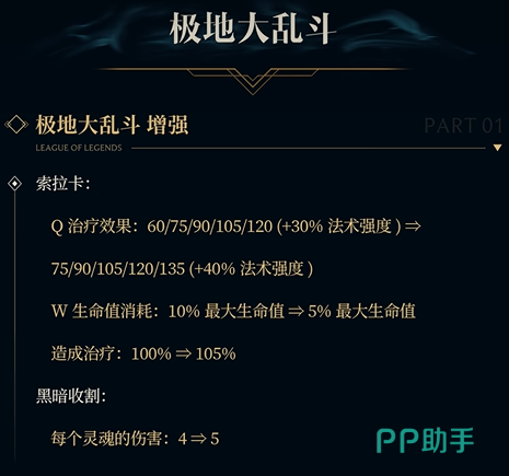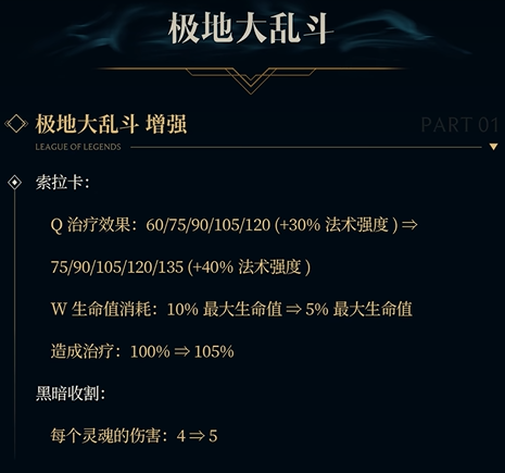 除了主流模式的更新外,极地大乱斗也迎来了一波不小的变化。这一次,索拉卡的治疗效果和生命值消耗得到了增强,而瑟提则稍微被削弱,冷却时间延长并且恢复机制做了一些调整。这些变动无疑会影响极地大乱斗的节奏,带来更多的战略变化,玩家们将需要根据新的改动来调整自己的玩法策略。