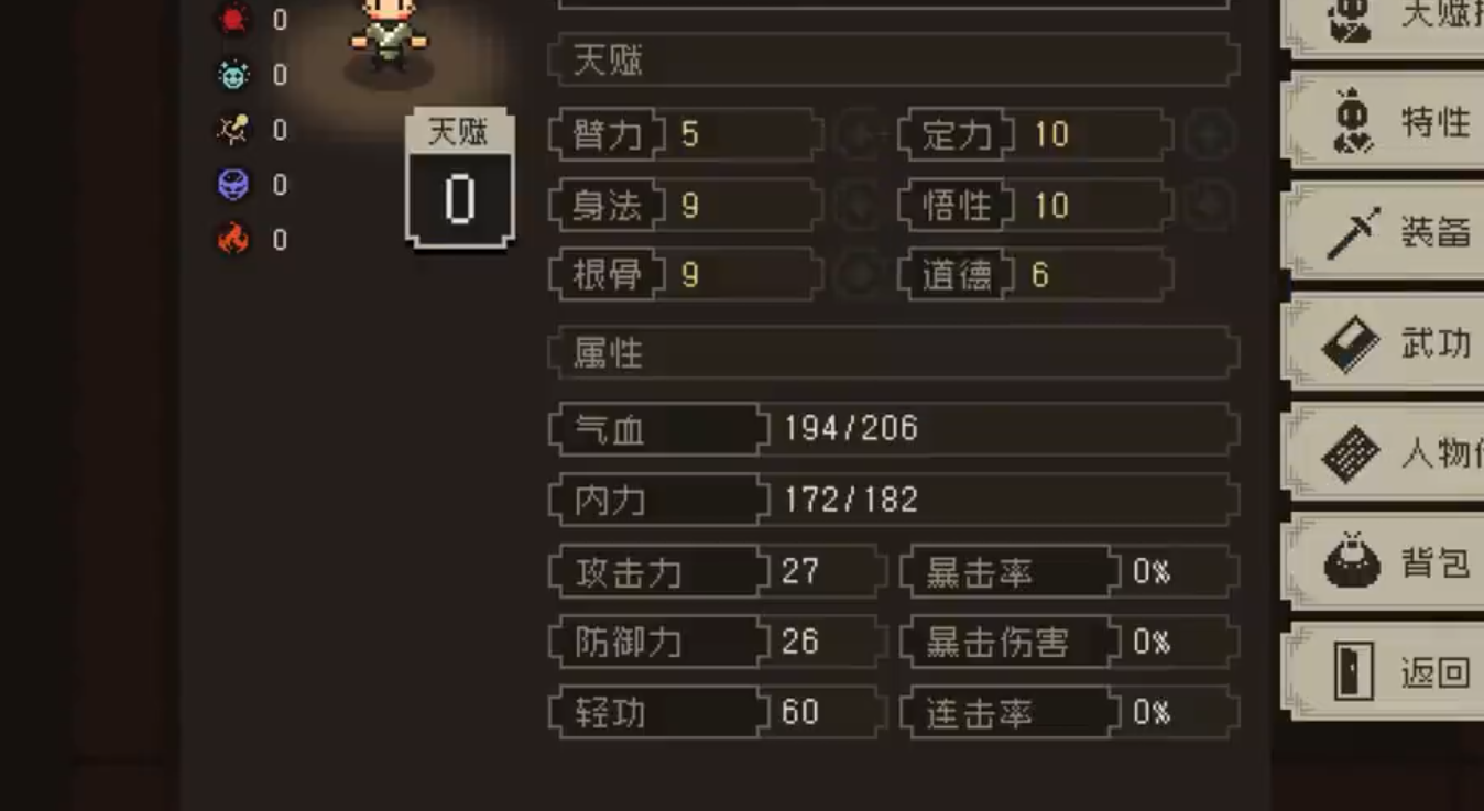 小伙伴们进入游戏的期间需要创建属于自己在古风世界的角色,然后在人物界面中观察自己的属性,分为特性、武功等,有很多的暗器使用都可以大大的增加玩家的伤害。