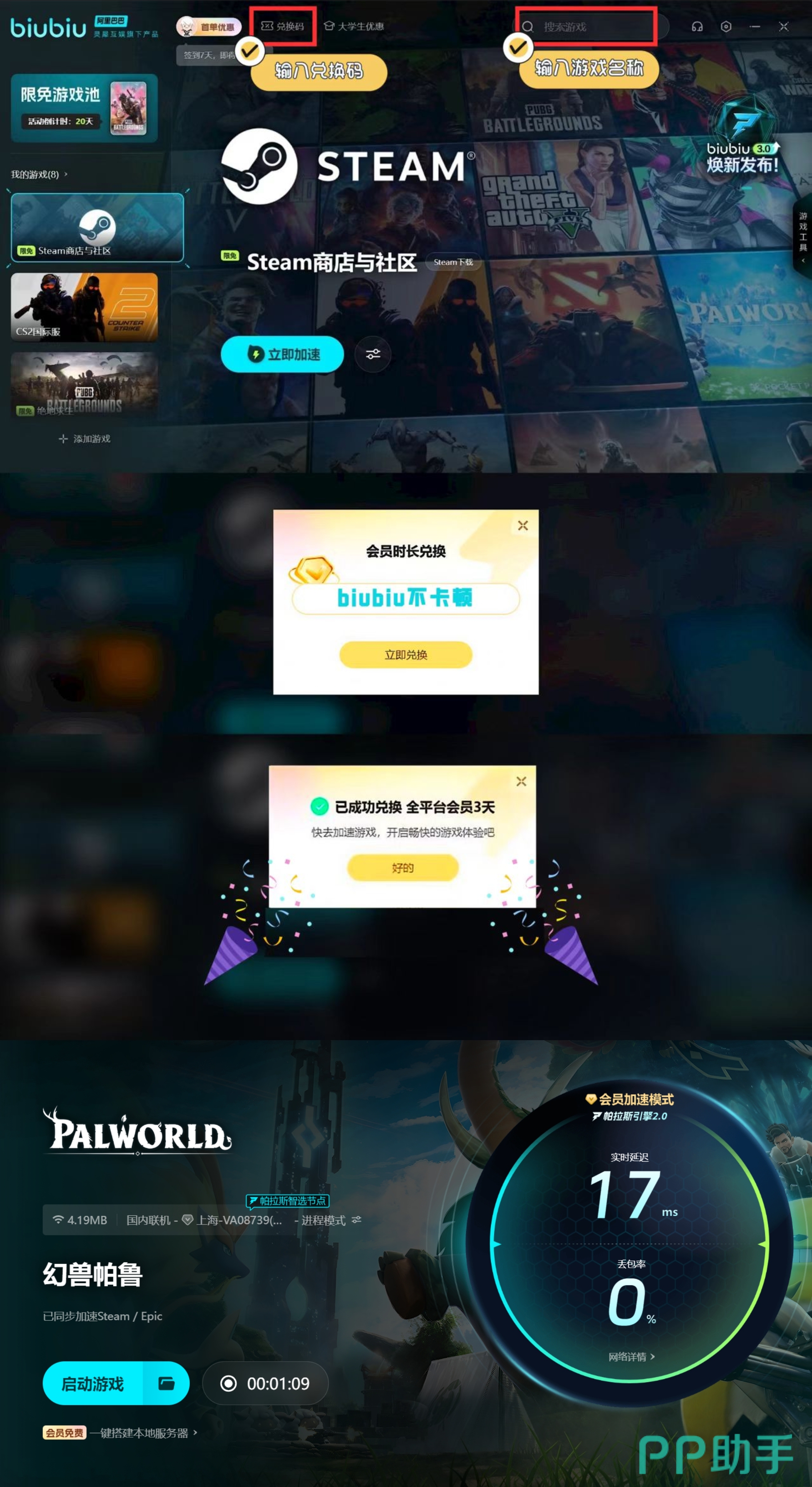 目前这就是小编提供的幻兽帕鲁加速器选择哪个的全部信息了,幻兽帕鲁既可以单人游玩,也可以选择合作游玩,并且乐趣还更多,但要是频繁掉线那乐趣直接消失,那么biubiu就很值得选择哦!