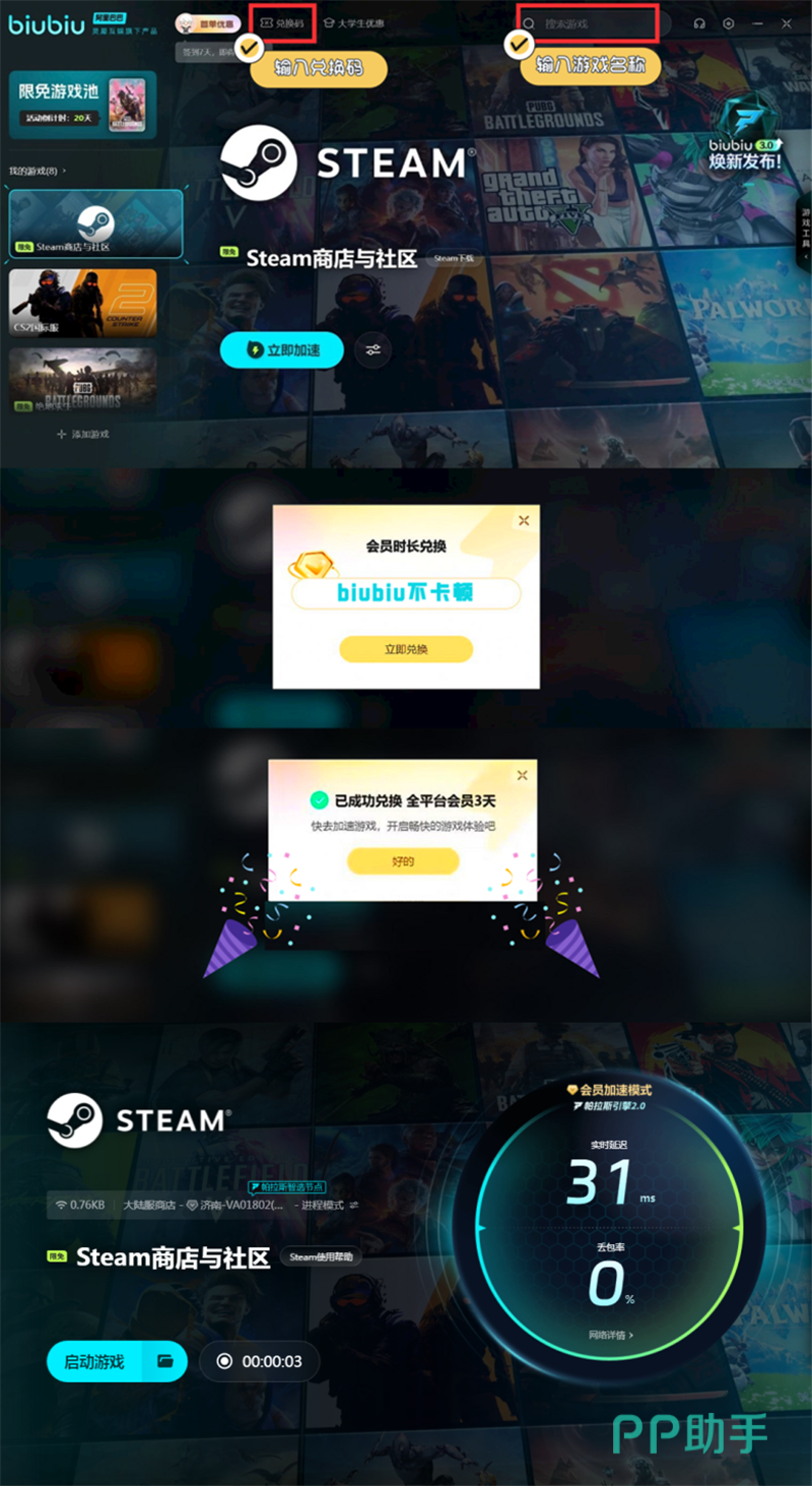 这款游戏可以在steam商店上直接免费下载到电脑中去玩,如果大家在连接steam商店或者是下载的时候遇到一些问题,可以通过biubiu加速器来优化解决。现在biubiu推出了兑换码福利,每个biubiu号都可以输入兑换码【biubiu不卡顿】,获得72小时会员时间,另外如果是刚刚注册的新号,还有额外三小时会员时间能。领取到这些免费试用福利,可以帮助大家轻松完成这款游戏的下载安装,进而进入其中感受独特的休闲玩法。只需要疯狂敲击就可以获得各种各样的好看道具,而且猫咪外形也很治愈,非常解压。
