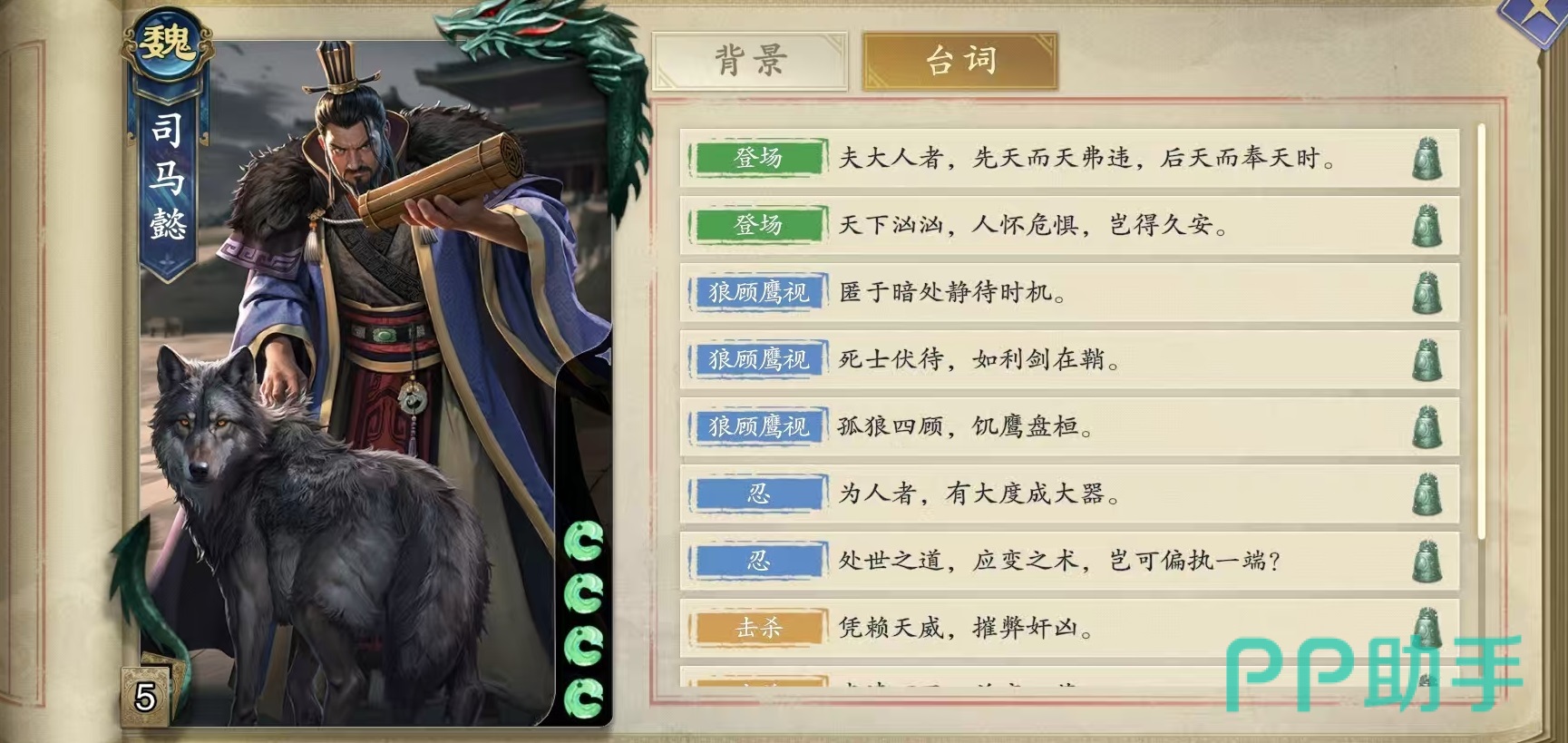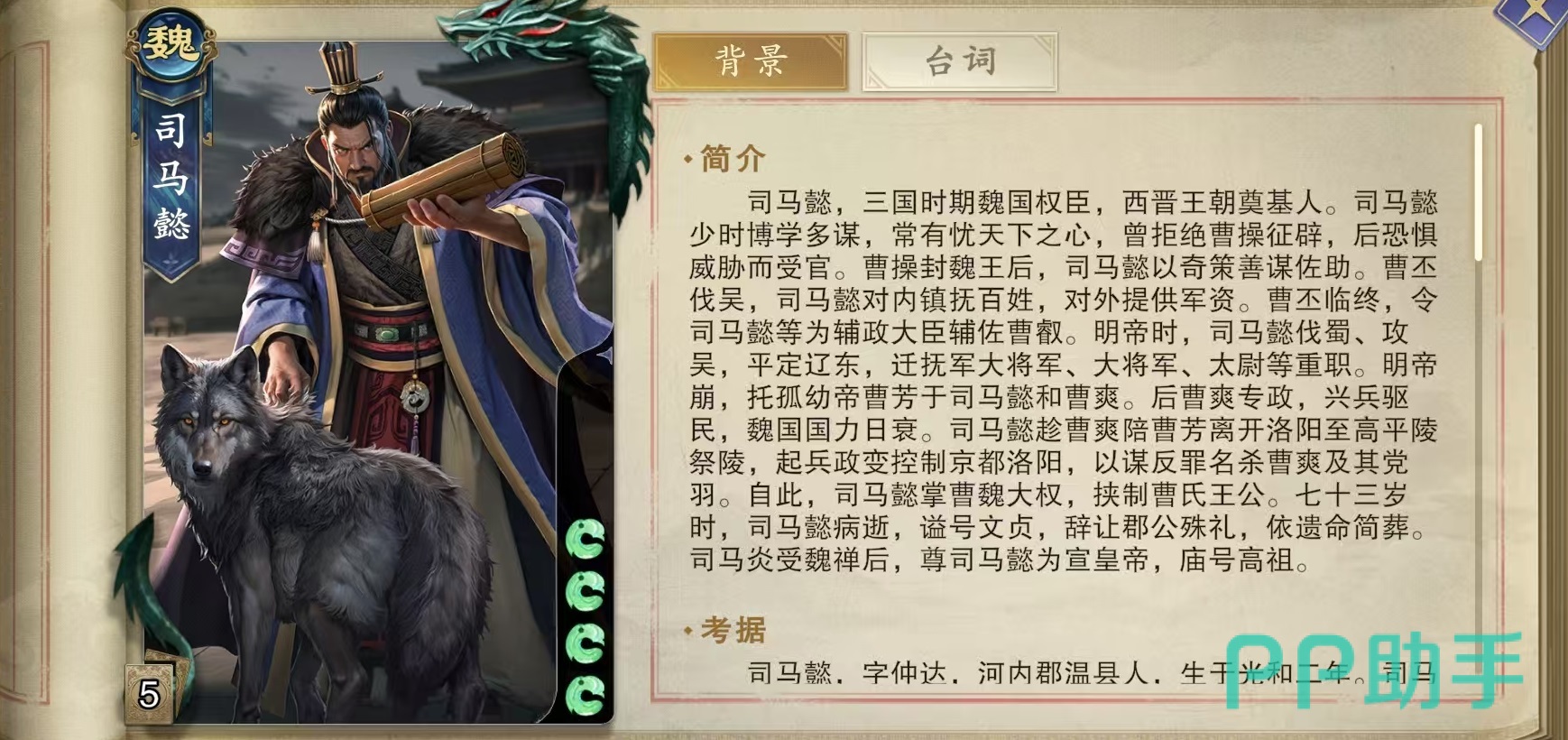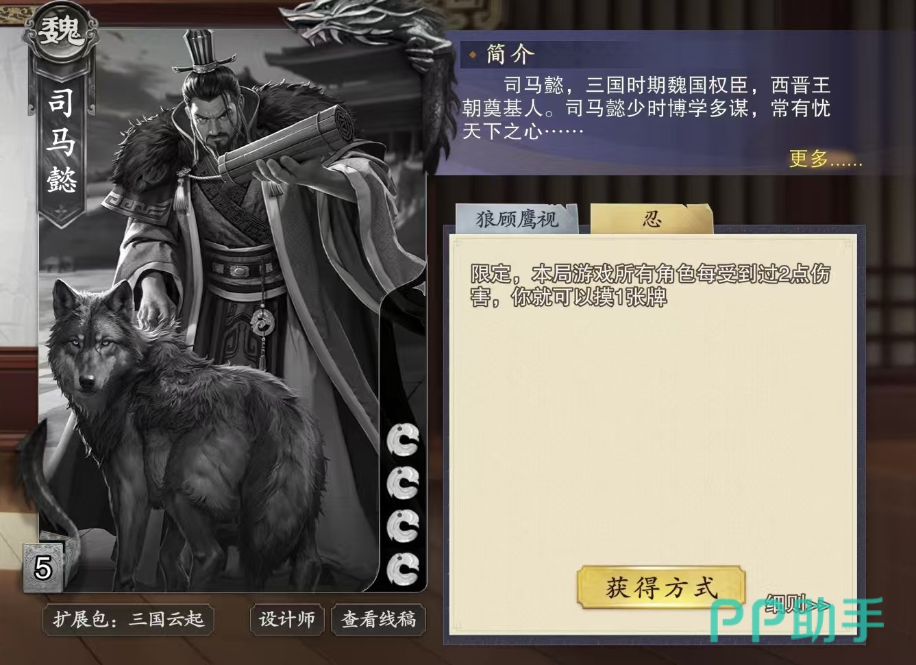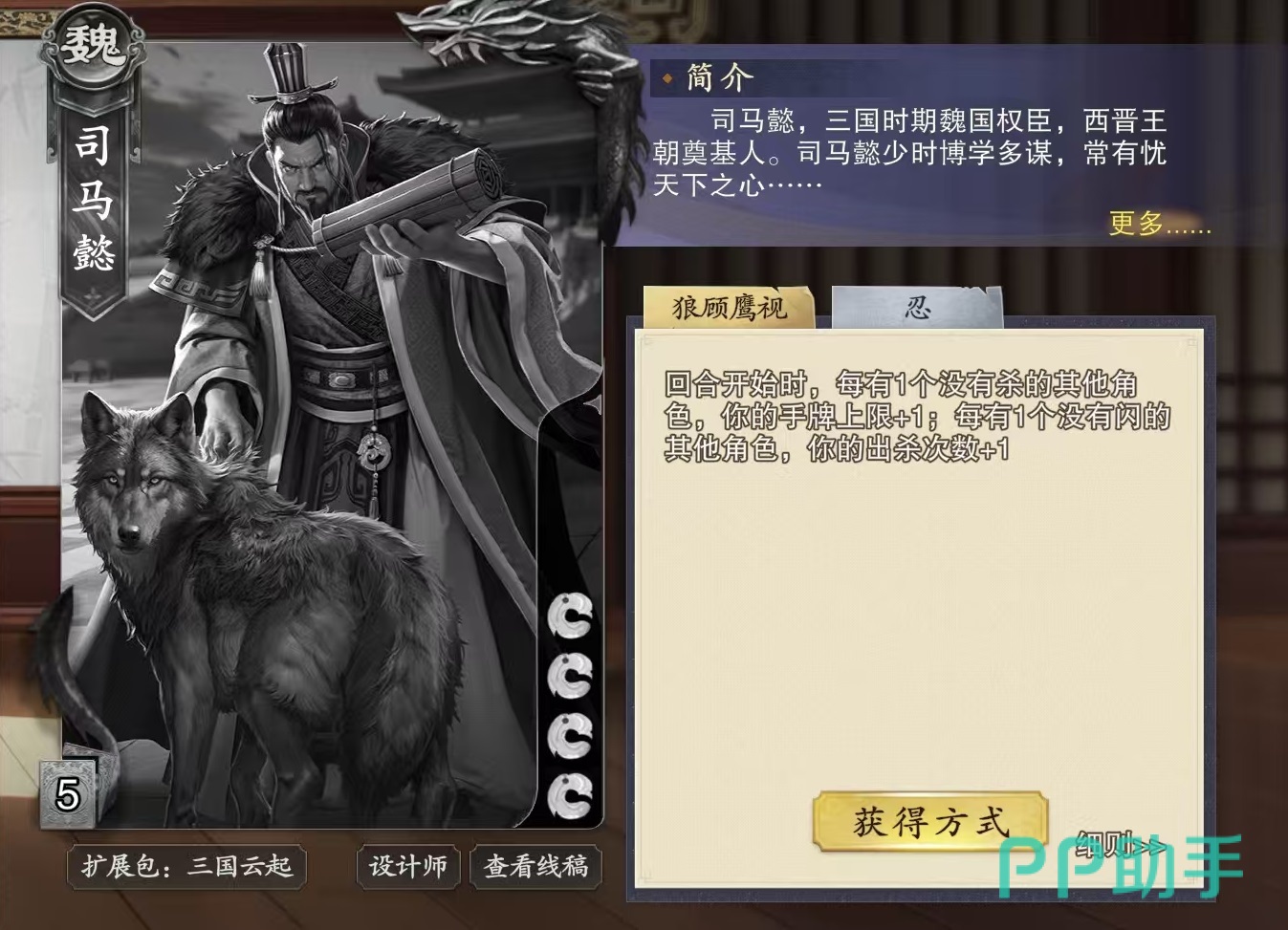 司马懿是属于魏国阵营的武将,他初始为四滴血,两个技能分别是狼顾鹰视和忍,这两个技能设计都非常有特点。狼顾鹰视的效果是回合开始时,场上每有一个没有杀的其他角色,那么司马懿手牌上限就能增加一点,每有一个没有闪的其他角色,司马懿出杀次数就能加1。忍的效果是属于限定技,本局游戏所有角色每受到过两点伤害,司马懿就可以摸一张牌。
