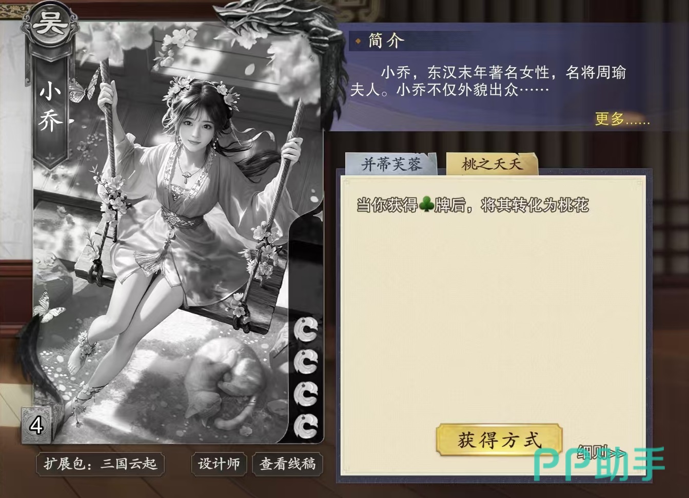 桃之夭夭的效果也很容易理解,只要获得梅花牌就可以发动此技能转换成桃花,转换之后目标卡牌在本机游戏中将会彻底改变。桃花的效果是消逝,另一名角色恢复一点体力或者是抵消即将受到的一次伤害。转化效果持续到本局结束,其实是先销毁目标牌,然后再添加新的桃花,并通过任何方式获得到手牌区的牌都会被转化。这样一来,小乔在生存方面就变得非常出色了,因为桃花本身就能回血或者是抵消伤害,所以很不容易被集火。
