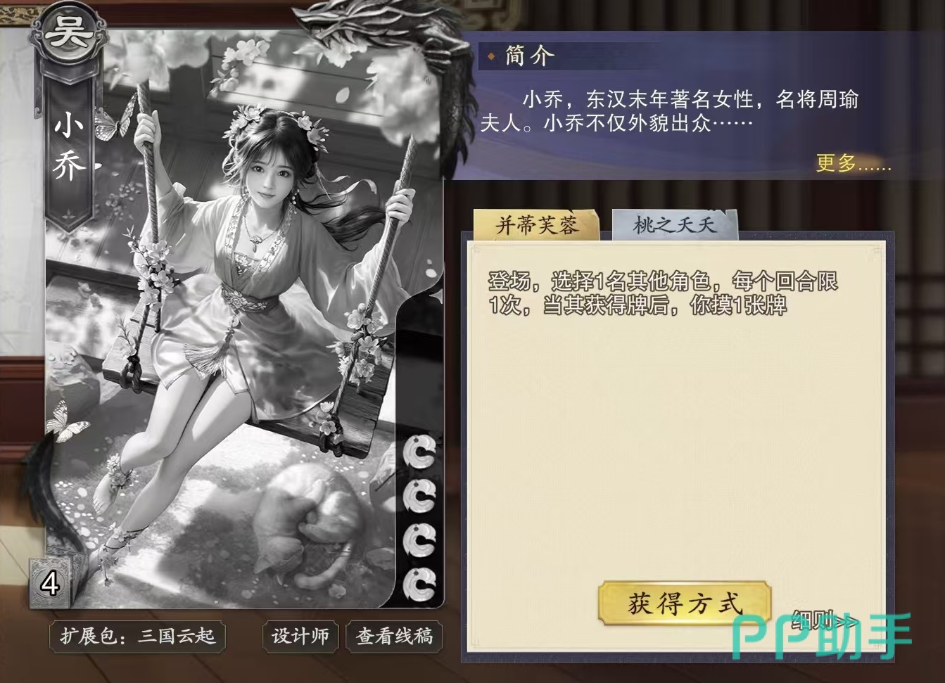 下调的两个技能分别是并蒂芙蓉和桃之夭夭。并蒂芙蓉效果是登场就可以选择一名其他角色,每回合限定一次,当其获得牌后,小乔就可以摸一张牌。桃之夭夭的效果是当获得梅花牌后,可以将其转化为桃花。