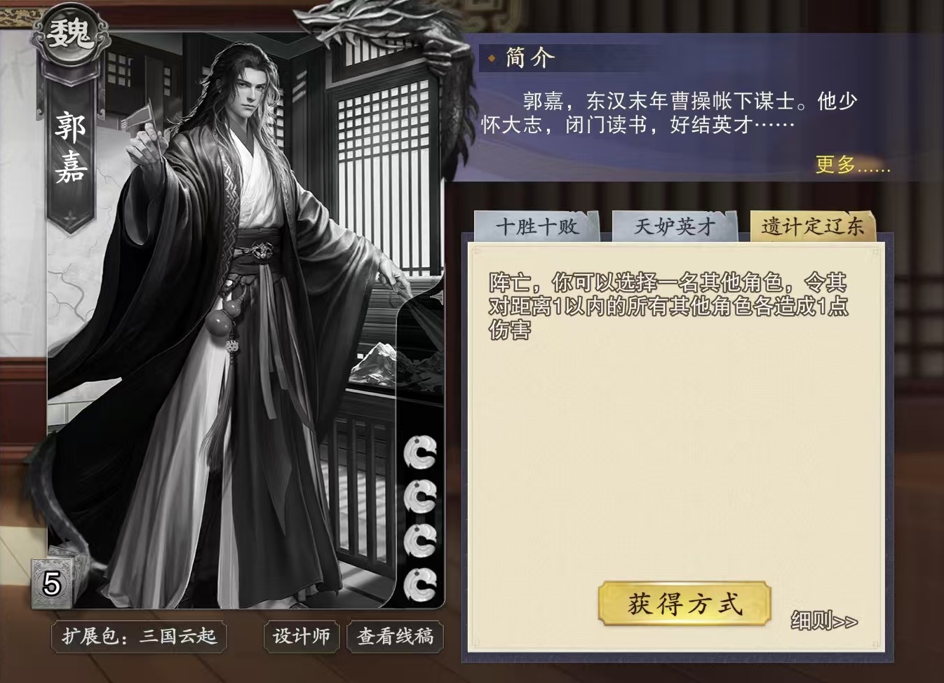 郭嘉是一张只有初始4滴血的卡牌,但是他有三个技能,分别是十胜十败,天妒英才和遗计定辽东。十胜十败的效果是受伤后就可以摸两张牌,然后选择任意一名其他角色,交给对方任意张手牌,还能令其下回合出杀的次数加1。天妒英才效果是在回合开始时进行卜卦,如果结果不是梅花则受到一点伤害,如果结果是梅花则获得卜卦的手牌。遗计定辽东,郭嘉阵亡后可以选择一名其他角色,令其对距离1以内的所有其他角色造成一点伤害。