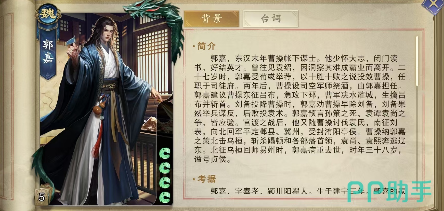 在历史中,郭嘉是东汉末年曹操帐下谋士。在辅佐曹操的过程中立下了很多功劳,拥有极高的谋略,出现在代号杀中的郭嘉自然也非常强势,今天小编来介绍一下代号杀郭嘉怎么玩。游戏中设计出的这些武将卡牌都有自身的技能特点,玩家只有在了解清楚这些技能效果之后才能真正上手使用。